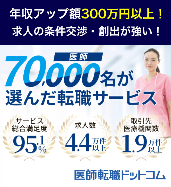 業界最大級の求人数44,000件を保有し、これまでに76,000以上の紹介実績があります。経験豊富なコンサルタントが円満退職の支援から、キャリア相談、面接同行など入職まで親身にサポート。場合によっては「転職はお勧めしない」などのアドバイスも行うほど丁寧な対応が特徴です。 「当直無し」「週4日勤務」「年収アップ」など言い出しづらい勤務条件も、医療機関と条件交渉をしてくれます(調整・交渉力の満足度は94.5%!)。また内部事情も教えてくれた上で転職活動が出来るので、ミスマッチも無く転職出来ます。2026年4月入職をお考えの先生に特にオススメします。